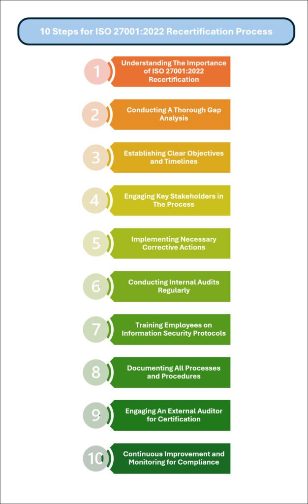 By following these steps and ensuring that objectives and timelines are clearly defined and communicated, organizations can increase their chances of a successful ISO 27001:2022 recertification process.
